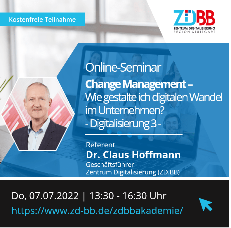 Nicht alle werden von der Digitalisierung im Unternehmen auf Anhieb begeistert sein. Schnell kommt es zu einem grundlegenden Veränderungsprozess, der bei fehlender Steuerung leicht außer Kontrolle geraten kann. Widerstände, hitzige Debatten und „hochkochende“ Emotionen sind hierbei keine Seltenheit. Wie Sie den digitalen Wandel in Ihrem Unternehmen erfolgreich gestalten und kommunizieren, erfahren Sie in dem Seminar.