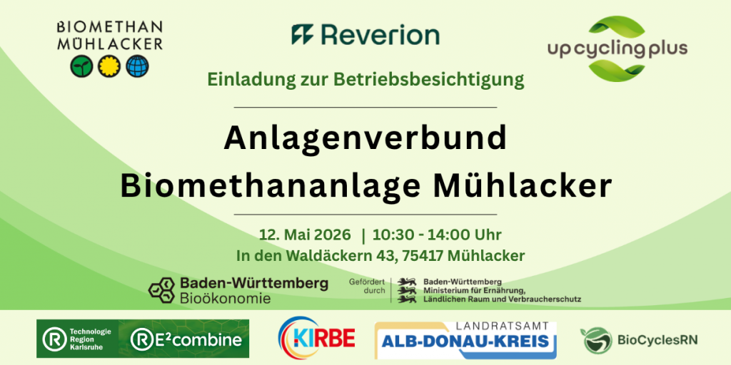 Die vier regionalen Projekte der Förderlinie „Initiativen zur Weiterentwicklung der Leitregion Nachhaltige Bioökonomie Baden-Württemberg“ – RE²combine (TechnologieRegion Karlsruhe GmbH mit Fraunhofer ISI), BÖKADO (Alb-Donau-Kreis mit Fraunhofer IGB), BioCyclesRN (Stadt Mannheim mit KIT IIP) und KIRBE (Zentrum für Digitalisierung Landkreis Böblingen mit der Hochschule Reutlingen) – laden zu einer gemeinsamen Best-Practice-Betriebsbesichtigung des innovativen Anlagenkomplexes Biomethan Mühlacker ein. Vor Ort werden die Zukunftspotenziale von Biogasanlagen als integrierte Bioraffinerien sichtbar. Das gemeinsame Event bietet einen kompakten Einblick in innovative Technologien entlang der bioökonomischen Wertschöpfungsketten und die Weiterentwicklung bestehender Biogasanlagen zu hochmodernen Bioraffinerie-Systemen.
